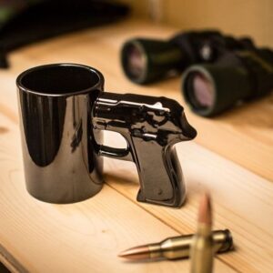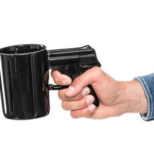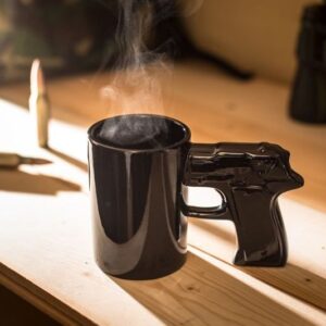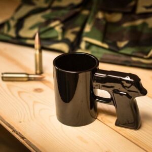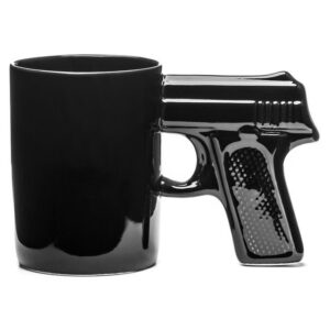 Funkcijas: – pistoles formas keramikas krūze – Jautra pistoles forma, kas jūsu iecienītākajam dzērienam piešķir uztraukumu – Dzeriet no šīs krūzes grauzdiņus tikai mierpilniem gadījumiem – Mazgāt tikai ar rokām.