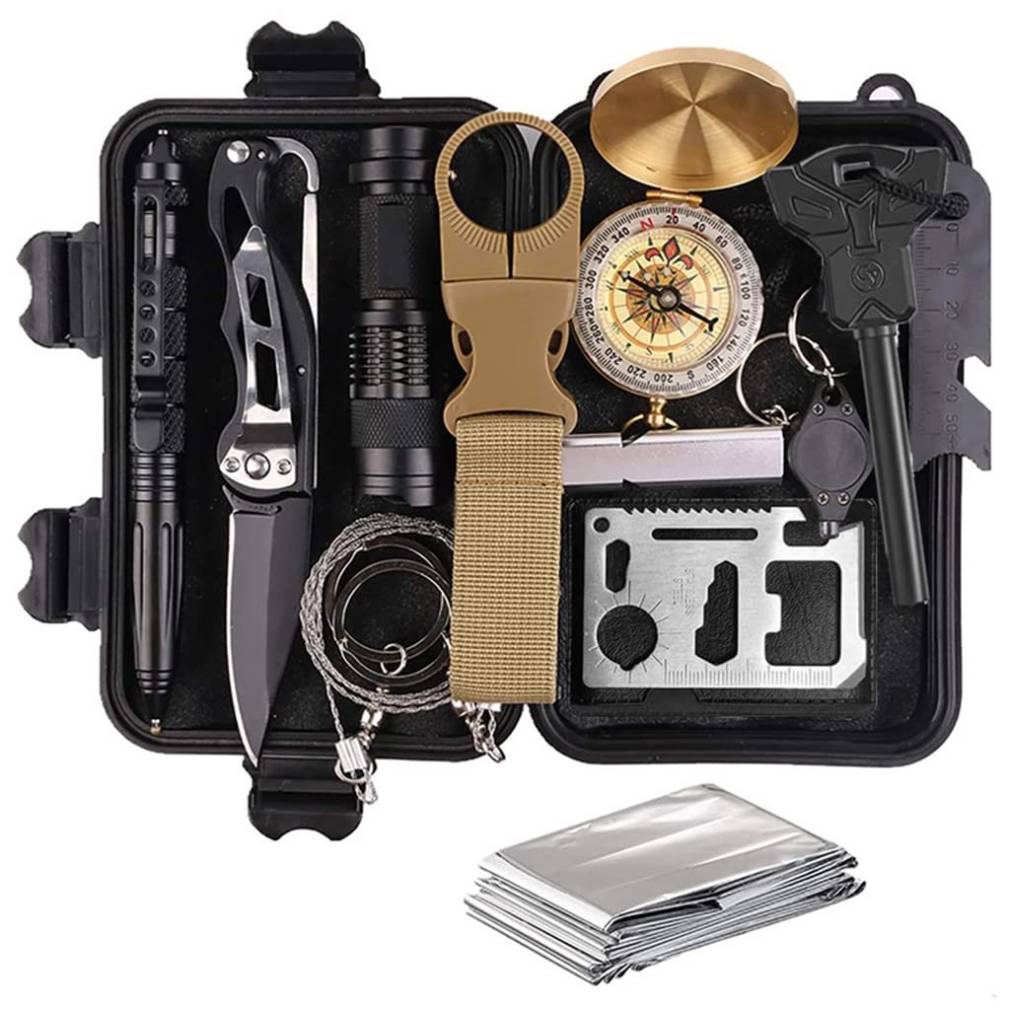 Izdzīvošanas komplekts 10 piederumi (daudzfunkcionālā vizītkarte, nazis, taktiskā pildspalva, lukturis)