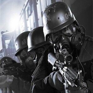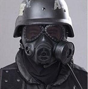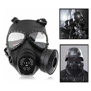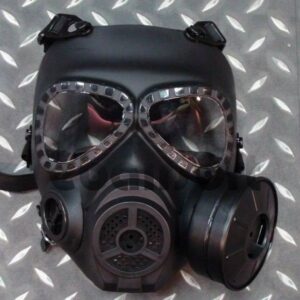 Gāzes kara maska ASG, peintbolam vai kara spēlei. Funkcijas: – kara spēļu maska (ASG, peintbols) – ar miglas filtru un ventilāciju – regulējamas siksnas – ar akumulatoru darbināms miglas filtrs – izmērs: apmēram: 22 x 14 x 22 cm – krāsa: melna – iekļauts mikrošķiedras audums