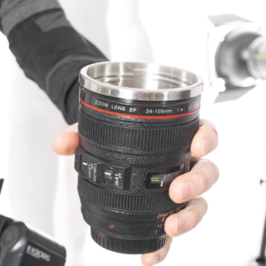 Termokrūze ar vāciņu, kas izskatās kā objektīvs.