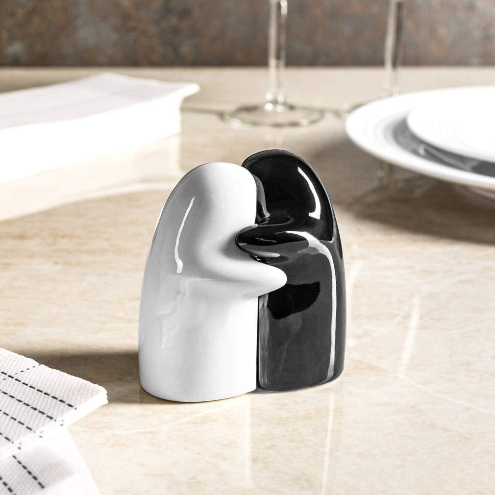 Papildiniet savas virtuves garšvielu plauktiņu ar visu laiku jaukākajiem sāls un piparu trauciņiem 😉 Funkcijas: – apskaujošs pāris, melns un balts sāls un piparu trauciņi – brīnišķīgs papildinājums, jauks galda dekors jebkurai virtuvei – ienes harmoniju un līdzsvars jūsu virtuvei un ēdienam – ar silikona aizbāžņiem pildīšanai – burvīga maza dāvana daudziem gadījumiem. Materiāls: keramika